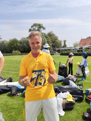 The weather gods (no doubt favored by the gentlemen's numerous drinks over the years) had arranged a beautiful Saturday with perfect cricket weather. Under blue skies and a radiant sun, the first veterans, current players, and a few special guests (VIOPs, very special opponent players) met, and it soon became a delightful reminiscing. Han and Bart also arrived. They were each captain of their own team (Han's Hurricanes and Bart's Bazzballers) and were given a matching jersey to effectively manage their players. The gentlemen took the toss (or, as Han said: "lose the toss, but win the game") and went head-to-head. A good number of spectators had also gathered to catch a glimpse of this unique Saturday afternoon match.