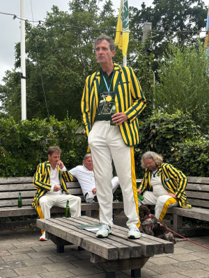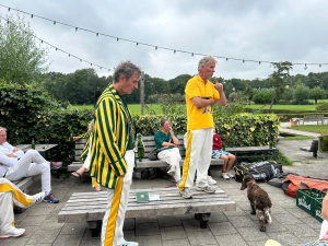 With gratitude for the long-standing significance of both gentlemen within the primarily Groen-Geel teams, they reflected at length on all their past cricket adventures, the match, and the shared history at Groen-Geel, which was also celebrating its 75th anniversary (cricket division). Han and Bart, Uvuraj, and (briefly) myself gave speeches, and drinks, flowers, and gifts were exchanged. Afterward, both gentlemen received the match ball signed by everyone. With snacks, drinks, and a barbecue, it turned into a late and convivial evening. And for the "reunionists" among the participants, it left them wanting more so much that perhaps an annual tradition has been born (looking at you, Miedema, Krabbie)!